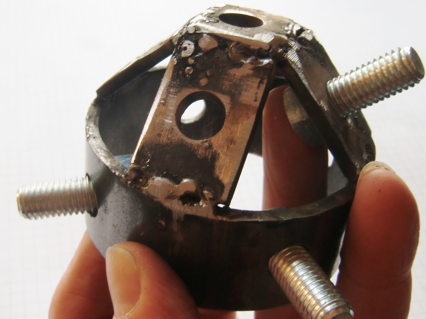 The connector is made of a simple standard steel pipe cut off and steel plate strips welded together by a local smith.